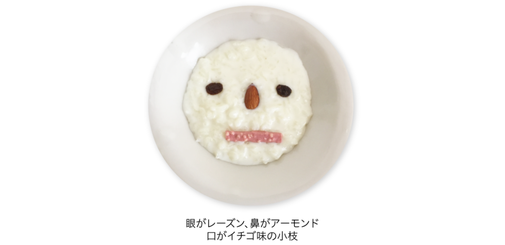 バターは、③のときに入れてもいいし、⑥の牛乳を入れた後で加えても。飾りつけは自由に。お好みでカカオやシナモンパウダーをかけたり、ハチミツをたらしてもおいしい。画像の鼻に使っているアーモンドは、お粥に隠して、それが当たった人はプレゼントが貰えるという遊びもある。