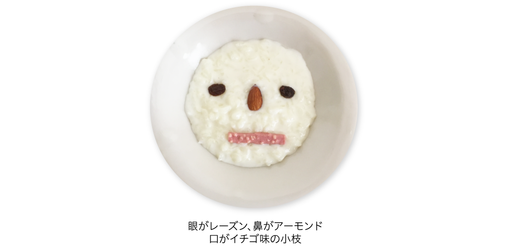 バターは、③のときに入れてもいいし、⑥の牛乳を入れた後で加えても。飾りつけは自由に。お好みでカカオやシナモンパウダーをかけたり、ハチミツをたらしてもおいしい。画像の鼻に使っているアーモンドは、お粥に隠して、それが当たった人はプレゼントが貰えるという遊びもある。