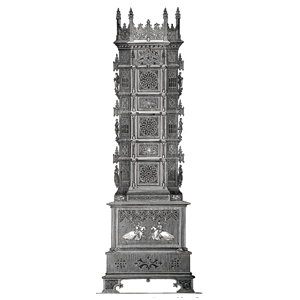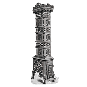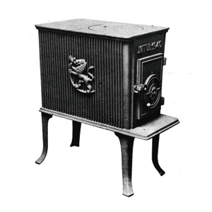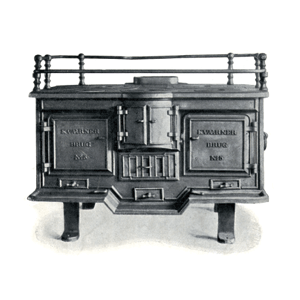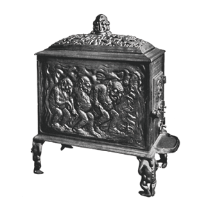 1920年頃のトロールストーブ220。調理もできる実用的ストーブ。森の精霊トロールを全面に装飾。トップで調理できるようになっており、使用しない場合は写真のようにデコレーティブトップでカバー。
